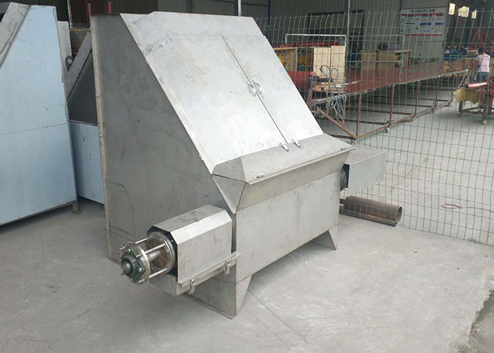 斜篩式固液分離機主要由主機、液下切割泵、電控箱、 管道等設(shè)備組成。主機由機體、篩網(wǎng)、擠壓絞龍、減速電機、配重錘、卸料裝置等部件組成。其工作過程如下:無堵塞泵將含水較大的豬糞水抽入分離機篩板,經(jīng)過篩板初步過濾,剩余的物料落入集料槽,此時經(jīng)動力傳動, 擠壓絞龍將糞水逐漸推向機體前方,同時不斷提高前緣的壓力, 迫使物料中的水分在邊壓帶濾的作用下擠出篩網(wǎng),流出排水管。擠壓機的工作是連續(xù)的,其物料不斷泵入機體,前緣的壓力不斷增大,當(dāng)大到一定程度時,就將卸料口頂開,擠出擠壓口,達(dá)到擠壓出料的目的。斜篩式固液分離機自動化水平高、操作簡單、易維修、日處理量大,動力消耗低、適合連續(xù)作業(yè),無論在國內(nèi)外都是同行業(yè)較為先進(jìn)的技術(shù)設(shè)備。